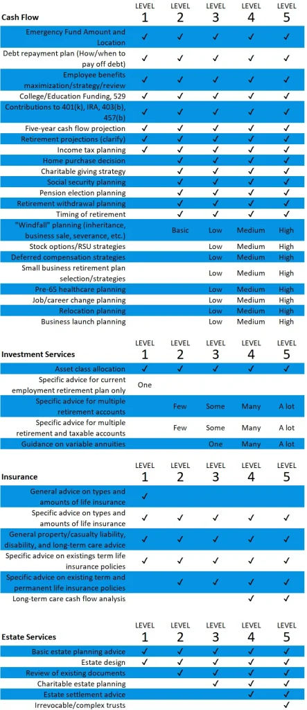 This chart lists most of the different aspects of financial planning. The levels represent the degree of complexity and will help you get an idea of how much financial planning will cost with Open Path Financial. To review our pricing for each level, visit our fees page.